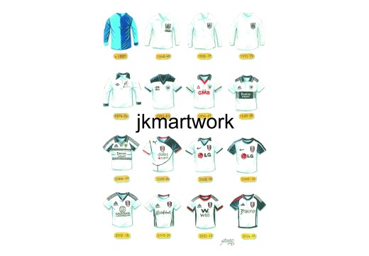 Relive the golden moments of football history with this exclusive t-shirt showcasing a collection of retro Fulham FC football kits from over the years. This unique design brings together iconic jerseys that any football fan will recognise, capturing the evolution of the game’s greatest kits in a bold and stylish print.
