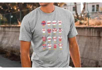 Relive the golden moments of football history with this exclusive t-shirt showcasing a collection of retro Liverpool FC football kits from over the years.