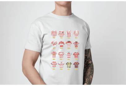 Relive the golden moments of Rugby League history with this exclusive t-shirt showcasing a collection of retro Hull Kingston Rovers Rugby League kits from over the years.