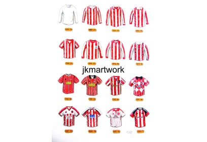 Relive the golden moments of football history with this exclusive t-shirt showcasing a collection of retro Sheffield United FC football kits from over the years.