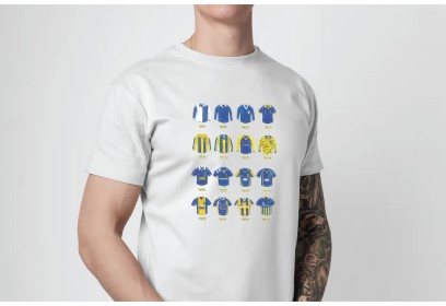Relive the golden moments of football history with this exclusive t-shirt showcasing a collection of retro York City FC football kits from over the years.