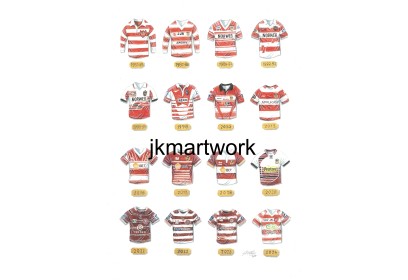 Relive the golden moments of Rugby League history with this exclusive t-shirt showcasing a collection of retro Wigan Warriors Rugby League kits from over the years.