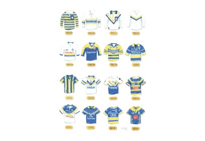 Relive the golden moments of Rugby League history with this exclusive t-shirt showcasing a collection of retro Warrington Wolves Rugby League kits from over the years.